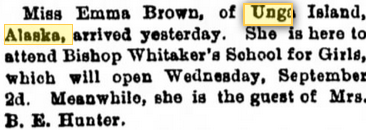 After 1891, EMMA attended Miss JEANNE BOLTE's French & English school in San Francisco. According to newspaper accounts, she returned to Unga Island, Alaska from San Francisco in the summer of 1895.